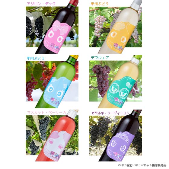山梨県内の6つのワイナリーとほっぺちゃん6人のコラボワインのセットです。