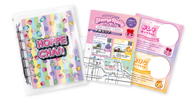 A6サイズのスタンプ帳。山梨県内の6つのワイナリーを巡るスタンプラリーに持参してスタンプを押してください。Z世代には懐かしいバインダーの『プロフィール帳』タイプです。シール、小物などが入るジッパー付バインダーポケット付きです。透明なカバーには、ほっぺちゃんの箔押しがキラリと光っています。お一人様2冊まで購入できます。